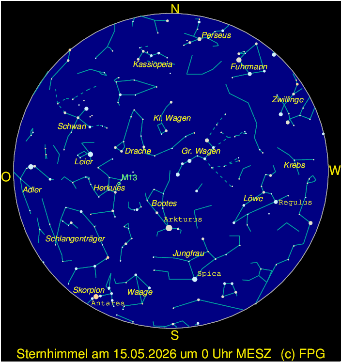 Mit den Zwillingen und dem Fuhrmann verabschieden sich die letzten Wintersternbilder am Westhorizont. Im Südwesten steht der Löwe mit dem hell leuchtenden Stern Regulus. Darüber, direkt über unseren Köpfen, zieht die Große Bärin und mit ihr auch der Große Wagen seine Bahn. Verlängert man den Bogen der drei Deichselsterne des großen Wagens in Richtung Südost-Horizont, landet man bei einem hellen, rötlich leuchtenden Stern. Das ist Arktur im Sternbild Bootes. Direkt östlich (also links) davon steht ein Halbkreis nicht ganz so hell leuchtender Sterne. Sie gehören zum Sternbild der Nördlichen Krone. Verlängert man den Bogen von Arktur aus weiter gen Horizont, fällt ein weiß-blau leuchtender Stern auf. Dieser heißt Spica und ist der hellste Stern in der Jungfrau. Knapp über dem Süd- und Südwest-Horizont schlängelt sich die Wasserschlange entlang. Das Sternbild besteht aber nur aus schwach leuchtenden Sternen. Es ist daher im lichtverschmutzten Deutschland nur selten zu erkennen.
