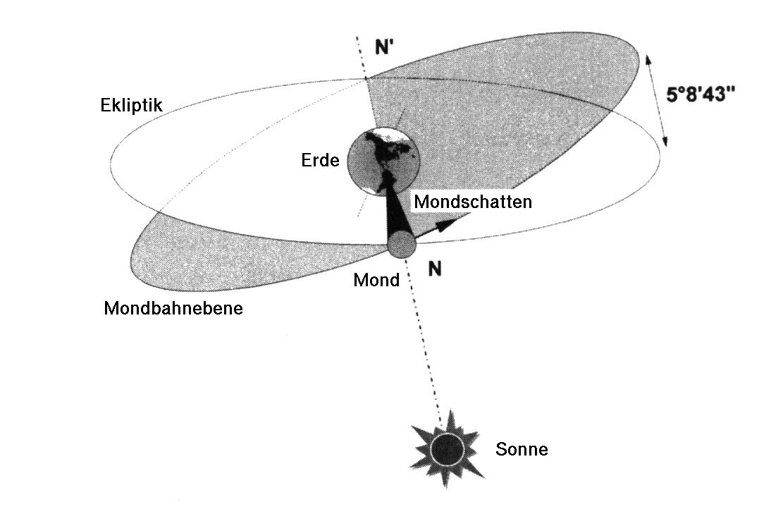 Wie kommt es zu einer Mondfinsternis? Der Mond umkreist die Erde in etwa einem Monat. Innerhalb dieser Zeit haben wir einmal Neumond und einmal Vollmond. Zur Zeit des Neumondes befindet sich der Mond zwischen Erde und Sonne, bei Vollmond dagegen steht die Erde zwischen Mond und Sonne. Somit würde der Schatten der Erde den Mond nun verfinstern. Dies geschieht aber nicht bei jedem Umlauf aufgrund der Neigung der Mondbahn gegenüber der Ebene, in der die Erde um die Sonne kreist, der sogenannten Ekliptik. Diese Neigung beträgt 5 Grad und führt dazu, dass der Mond zur Vollmondzeit meist etwas über oder unter dem Schatten durchläuft. Das Gleiche geschieht bei Neumond: hier bewegt sich die Erde scheinbar über oder unter dem Mondschatten hindurch, weshalb es nicht bei jedem Neumond eine Sonnenfinsternis gibt. Befindet sich der Mond zur Vollmondzeit auf seiner Bahn in einem der beiden Schnittpunkte der Mondbahn mit der Ekliptik (den sog. Knotenpunkten, in der Skizze N und N'), dann kommt es zu einer totalen Verfinsterung. Steht der Mond in der Nähe dieser Punkte, dann wird er nur teilweise verfinstert. Die Skizze zeigt den analogen Fall einer Sonnenfinsternis; bei einer Mondfinsternis stünde der Mond im Punkt N' im Schatten der Erde.