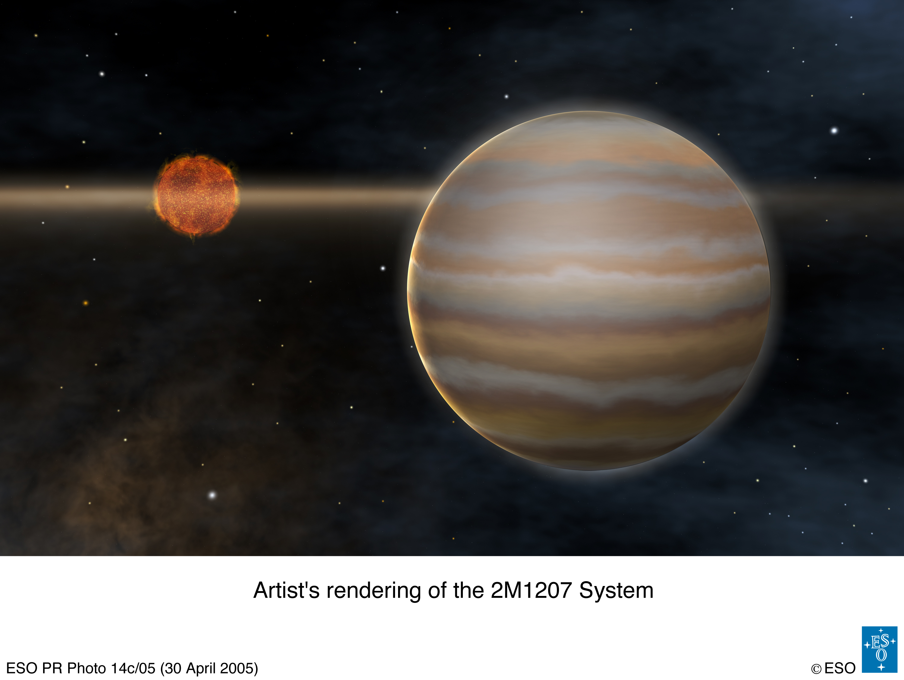 Bild 1 (162 kB), Bild 2 (1.6 MB): Ein im April 2004 von einem internationalen Astronomenteam mit einem 8.2-m Teleskop des ESO-VLT in Chile entdeckter schwacher Lichtpunkt ist vermutlich das erste direkte Abbild eines extrasolaren Planeten. Der Planet ist etwa fünfmal so massereich wie der Jupiter und umkreist einen extrem kühlen Stern, einen braunen Zwerg, in einem Abstand, der dem 55-fachem des Abstandes Erde - Sonne entspricht.. Quelle: European Southern Observatory (ESO).