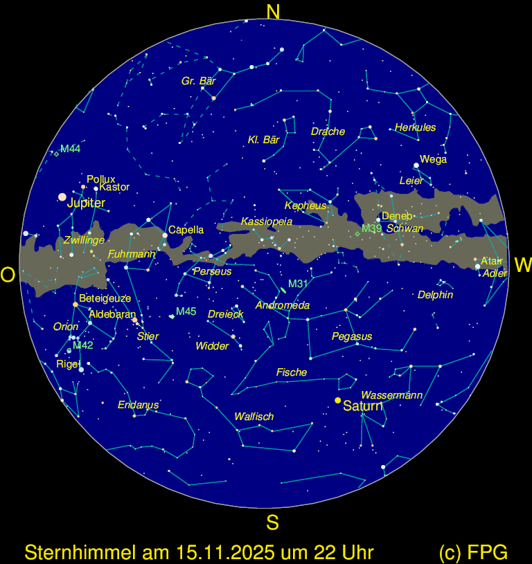 Am Westhimmel stehen noch die letzten Sommersternbilder. Auffallen tuen die beiden hellen Sterne Wega in der Leier und Deneb im Schwan. Am Osthimmel gehen dagegen schon die ersten Wintersternbilder auf. Noch knapp über dem Horizont steht dort der Orion. Schon deutlich höher ist das Sternbild Stier mit dem rötlich leuchtenden Stern Aldebaran zu finden. Neben ihm steht das Sternenfünfeck des Fuhrmanns. Darunter, gerade so über dem Horizont stehend, beginnen die Zwillinge aufzusteigen. Im Lateinischen heißen sie Gemini. Und damit sind wir bei den Geminiden.